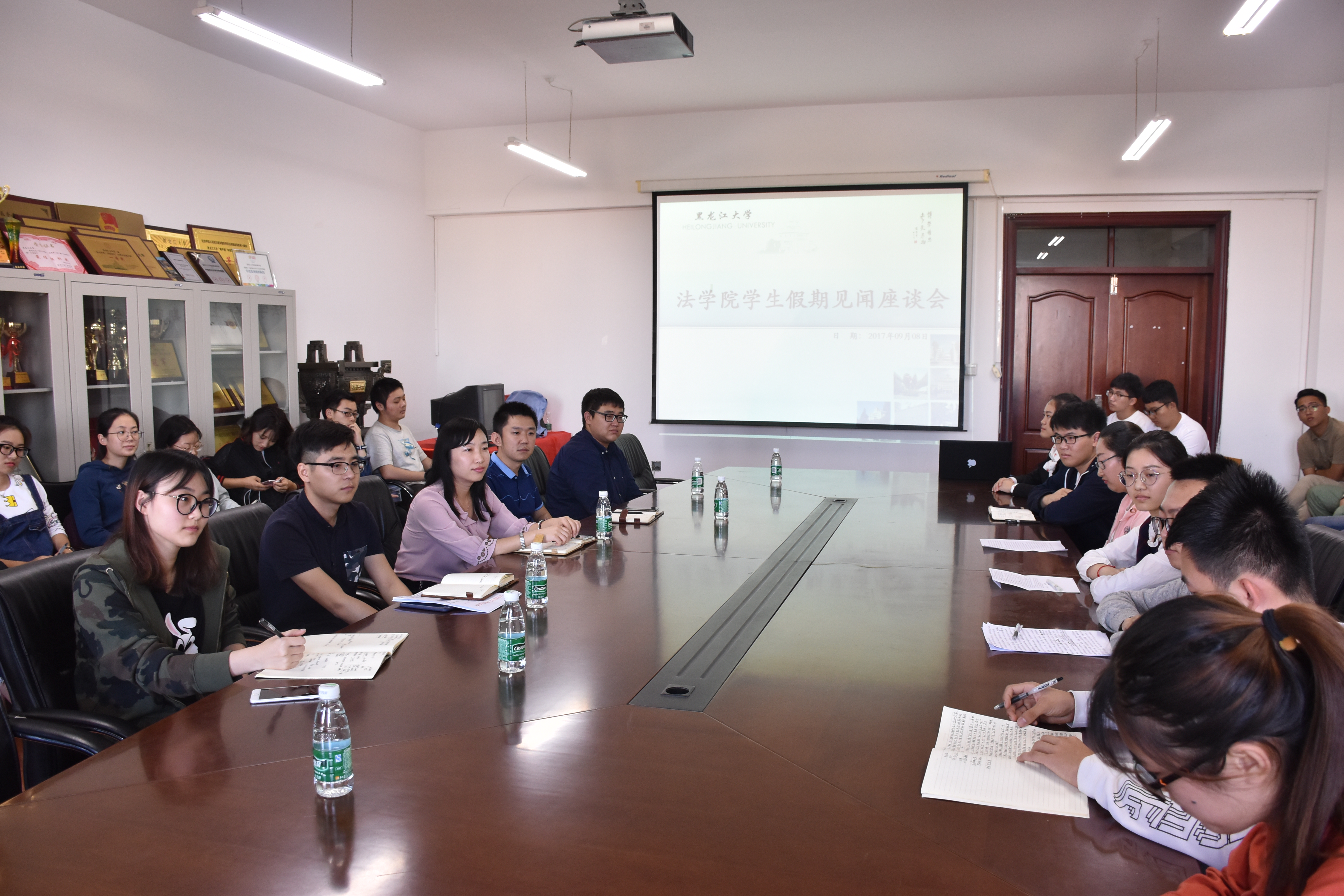 会上,同学们主要从暑期实习、志愿服务、旅游心得等方面的所见所感,描绘了自己丰富多彩的假期生活。其中,2014级许畅同学提到在律所实习过程中经常遇到曾经学习过却未曾深入思索的问题,深感自己在学术方面的不足;2016级刘铭同学谈到自己通过“三下乡”志愿服务活动,体会到奉献的意义和价值;2016级张婧同学讲述自己与亲历四川九寨沟地震的同学互动的经历,表示感受到伟大的国家力量,引起了在场同学的共鸣。同学们纷纷表示这个假期通过关注四川九寨沟地震救援行动、中国人民解放军建军90周年阅兵、香港回归祖国20周年等实事热点,以及《战狼2》、《建军大业》等优秀影视作品的熏陶,对国家的国际影响力有了更深切的感悟,对“中国梦”的实现充满信心。