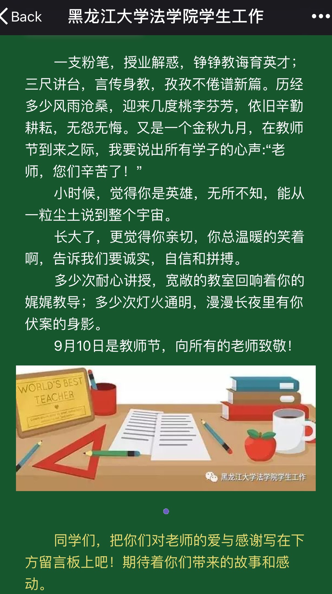 创新活动载体,倡导学生通过“敬一个礼、留一句言、寄一份情”来表达对教师们的感恩之情。充分利用微信公众平台等新媒体资源,开展了线上主题留言活动。同时,线下举办“笃信法律,感恩有您”主题留言板活动及感恩贺卡活动,文字间流露出学子们真挚的情义,节日的空气里弥漫着感恩的温情,全院上下以不同的形式表达了对老师的爱,构成教师节温馨和谐的教师颂歌。