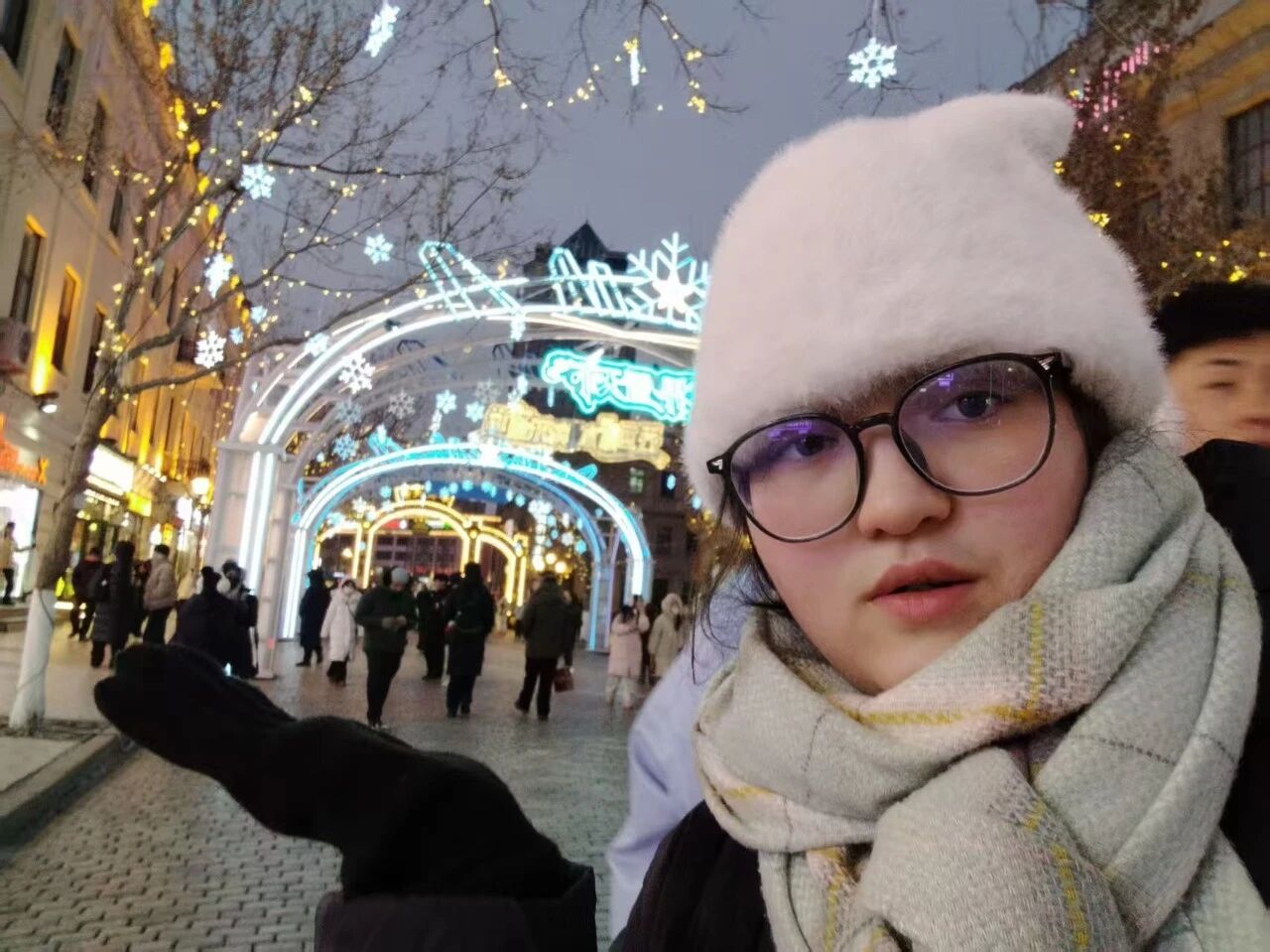 研学首站走进中央大街夜景与冰雪景观带,我们依次参观街区标志性拱门、主题冰雕、公共艺术装置与市民休闲场景。蜜雪冰城企鹅冰雕、冰钢琴等创意景观,将冰雪文化、青年审美与城市活力融为一体;街头亲子互动、游客驻足打卡、市民自在漫步的画面,生动展现出文旅融合背景下的城市烟火气。置身流光溢彩的冰雪世界,我们真切感受到哈尔滨“冰城夏都”的独特魅力,体会到地域文化创新表达带来的凝聚力与吸引力,在沉浸式体验中增强对家乡文化的认同感与自豪感。