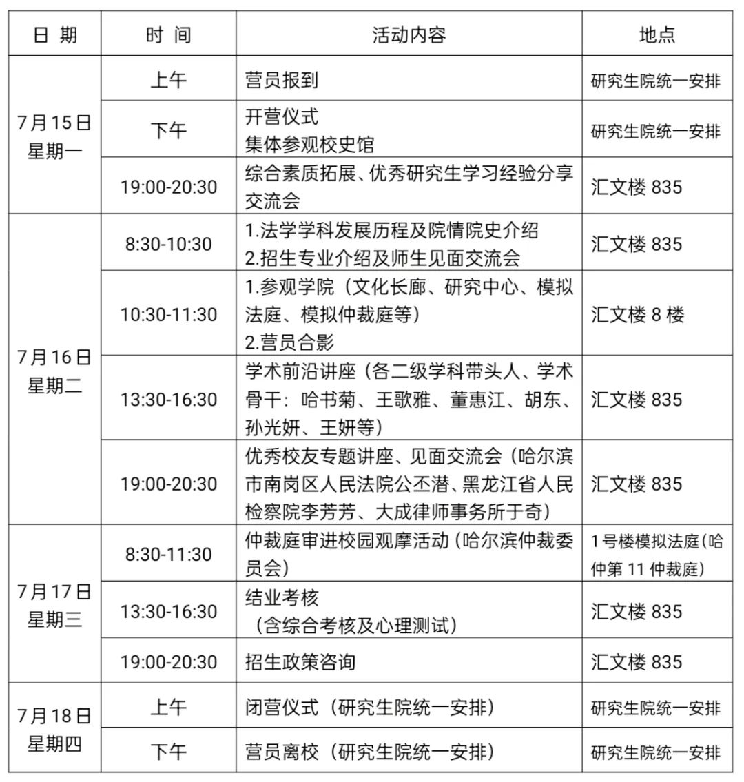 夏令营活动将于7月15日至18日举行,活动内容具体安排如下: