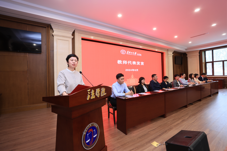 大家下午好!今天,我站在这里,心潮澎湃,无比荣幸能够作为教师代表,在这样一个意义非凡的时刻,与大家共同见证我们学子们人生旅途中的重要里程碑。夏至已至,万物生长,生机勃勃,正如在座的每一位同学,正准备展翅高飞,迎接新的挑战和机遇。在这个值得纪念的日子里,我想与大家探讨几个问题,这些问题或许能够引导我们思考如何在未来的生活中不断前行。首先,面对新时代的挑战,我们如何保持思想的敏锐和知识的更新?在快速变化的世界中,唯有不断学习,才能让我们的思想与时俱进,知识体系不断更新。其次,如何在追求事业成功的同时,保持内心的平衡和富足?真正的幸福,源自于内心的满足和对生活的热爱,而非外界的评价和物质的积累。再次,面对复杂的法律环境,我们如何坚守良知和正义的底线?作为法律人,我们不仅要理解法律条文的字面意义,更要深刻领会法律背后的精神和价值。面对这些问题,我并没有现成的答案,但我坚信,通过不懈的努力,我们可以成为终身学习者、幸福的普通人和正义的维护者。让我们首先成为终身学习者。在知识爆炸的时代,唯有不断学习,才能让我们紧跟时代的步伐,不断抵达未知之境。接着,让我们成为幸福的普通人。幸福不在于外界的认可,而在于内心的平和与满足。让我们珍惜每一天,爱自己,做一个简单而幸福的普通人。最后,让我们成为正义的维护者。作为法律人,我们要用理性和感性的平衡,去维护社会的公平与正义,捍卫人的尊严。