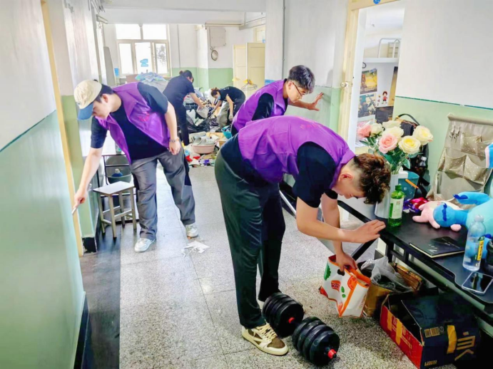活动现场,志愿者们身着紫色马甲,分组行动,有条不紊地开展各项工作。他们分工明确,有些专注于协助毕业生搬运沉重的行李,有的则投身于清理和打扫宿舍卫生的工作中,确保每一间宿舍在毕业生离开后都能保持干净整洁。志愿者们充分发扬“不怕苦、不怕累”的精神,共同配合协作,顺利完成毕业生行李搬运与宿舍整理。虽然志愿者们衣服早已被汗水浸湿,但他们的脸上仍然洋溢着笑容。最后,志愿者们也为即将启程的毕业生们送上最真挚的祝福,祝愿他们前程似锦,未来可期。