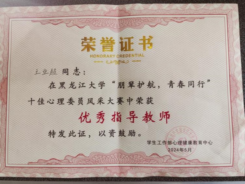 教师精心指导学生参加各类心理健康教育比赛,助力学生成长成才。其中,杜佰慧老师荣获2023-2024学年心理健康教育实践活动“优秀指导教师”、第四届“心沐阳光,手绘心语”心理手语操大赛“优秀指导教师”,王业超老师荣获“朋辈护航,青春同行”十佳心理委员风采大赛“优秀指导教师”称号。