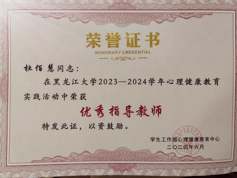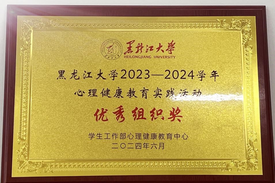 积极组织开展各类活动,荣获黑龙江大学2023-2024学年心理健康教育实践活动优秀组织奖、第四届“心沐阳光,手绘心语”心理手语操大赛三等奖、“朋辈护航,青春同行”十佳心理委员风采大赛二等奖、第十二届“演绎心世界”校园心理情景剧大赛三等奖,两名教师荣获“优秀指导教师”荣誉称号。