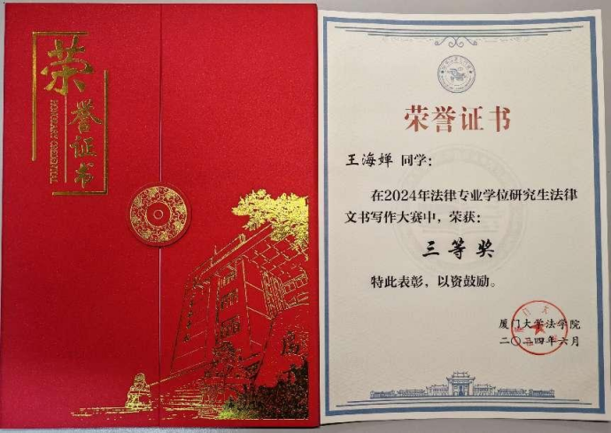 学生王海婵表现优异,以扎实的专业基础充分展现了法治人才风采。经过评委评审,王海婵与来自南京大学、重庆大学和大连海事大学等高校参赛选手一同获得本次法律文书写作大赛三等奖的出色成绩。