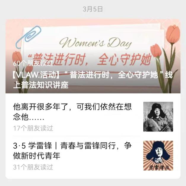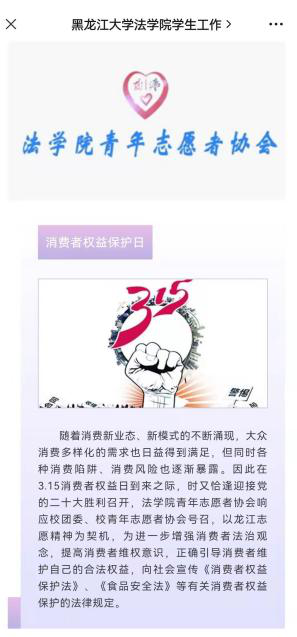 青年志愿者协会发布“3·15”“保护消费者权益,共促消费公平”普法宣传系列推送,根据《消费者权益保护法》等相关法律法规,对人民群众日常生活中常见的法律问题进行解答……近几次普法活动均引发校内外广泛关注,共发动志愿者30余人次,参与讲座的各院学生与社区居民逾百人,受益群众达3000人次以上。“法润人心,志愿有我”,新葡京网上赌场