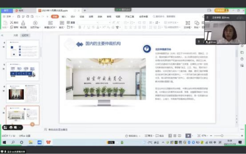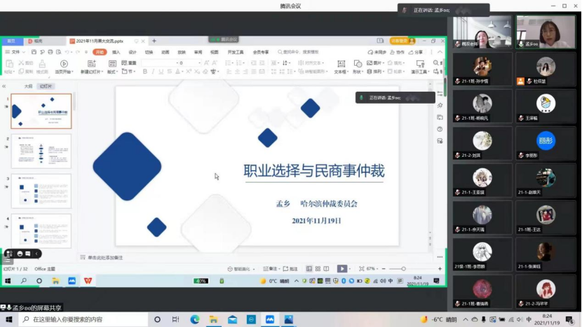 孟乡主要围绕“仲裁的概念与范围”“仲裁的特点与优势”“国内主要仲裁机构构成”“一名合格的仲裁员或仲裁秘书所需具备的条件及其主要工作”等四个方面展开细致的讲解,并对哈尔滨仲裁委员会做详细介绍。讲座过程中,同学们向孟乡提出有关职业选择的疑惑和仲裁工作的问题,孟乡耐心回复,反响热烈。