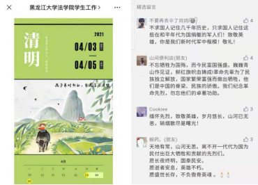 发布寄语活动主题推送,向先烈致敬,通过在推文下方写下寄语来祭奠先人、寄托哀思,以字抒情、以文传声。“巍巍青山作见证,鲜红旗帜血铸成”,引领红色精神传承、发扬典型示范作用,厚植爱国情怀、培育精神家园,有助于同学们养成见贤思齐、崇尚英雄、争做先锋的优良品德风尚。