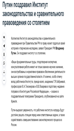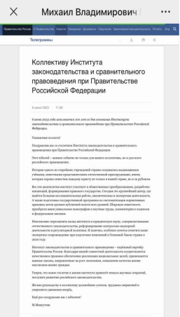 2023年6月6日是俄罗斯联邦政府直辖立法比较法研究院建院100周年纪念日,校庆庆典上俄罗斯联邦总统普京和俄罗斯联邦总理米舒斯京亲自发来贺信,同时,校庆典礼上播放了新葡京网上赌场-线上娱乐平台