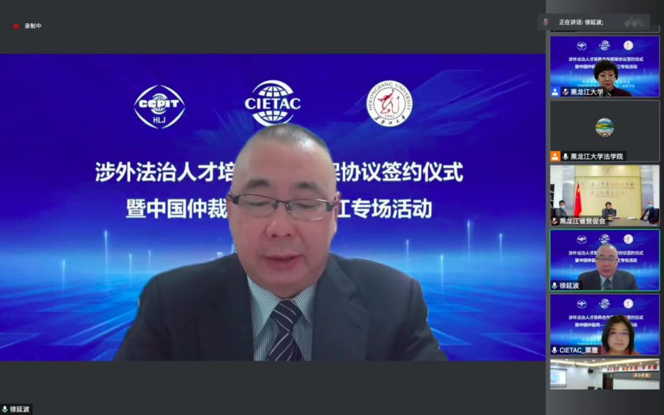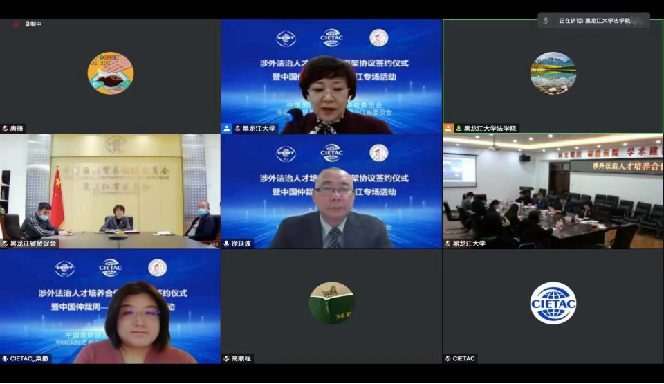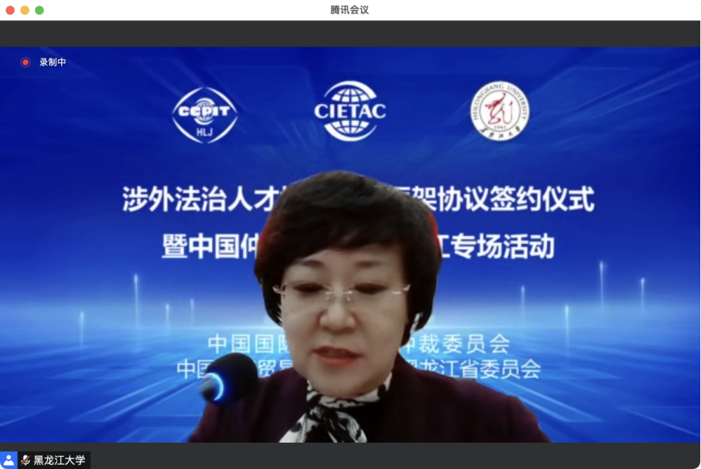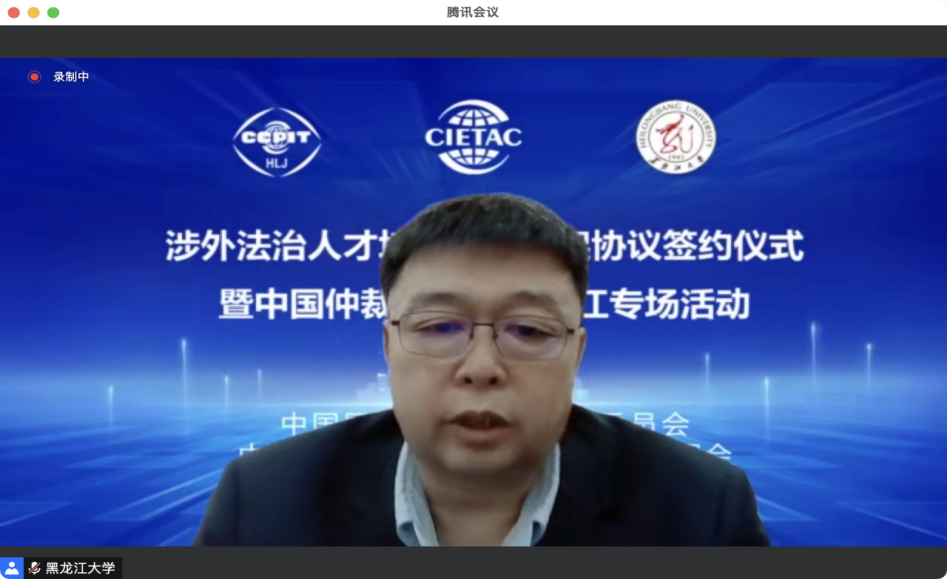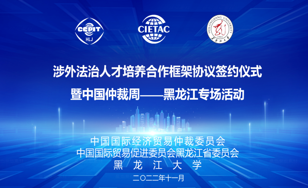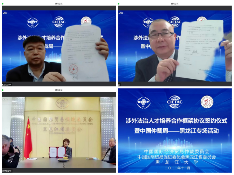为进一步培养涉外法治人才,深化国际商贸合作,完善涉外商事法律服务体系,中国国际经济贸易仲裁委员会、中国国际贸易促进委员会黑龙江省委员会与黑龙江大学三方合作的《涉外法治人才培养合作框架协议》签约仪式暨“中国仲裁周——黑龙江专场活动”于11月24日下午在黑龙江大学举行。