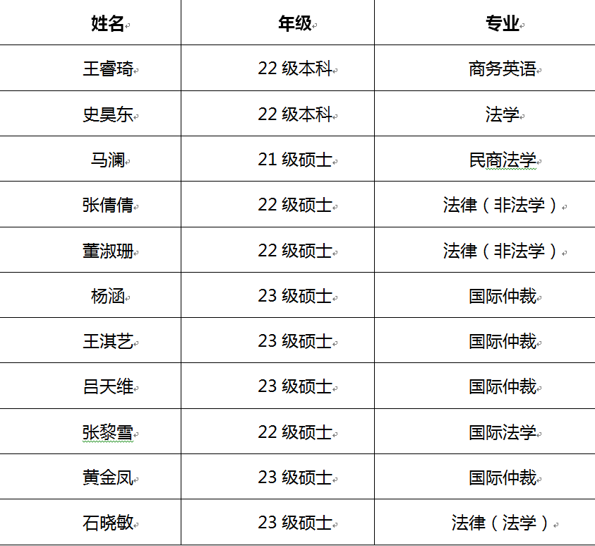 经“贸仲杯”黑龙江大学代表队指导教师组对32名报名者进行面试后,秉承着公平公开公正的原则,根据面试成绩,择优录取以下11名同学加入本届校代表队,具体名单如下: